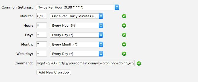 You need to replace yourdomain.com with your actual domain name. The Cron jobs tool has some of the most common schedules preset, so you can just select Every 30 minutes from the minutes drop-down and place a “*” symbol in the others.